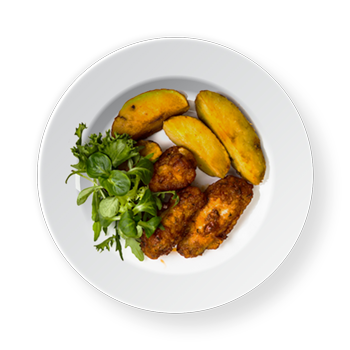 Pollo rebozado, jugo de cebolla sous vide y puré celeri